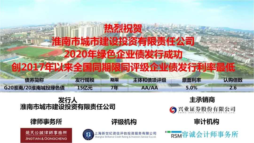 4月22日,建發(fā)集團所屬市城投公司成功發(fā)行首單綠色債券(債券簡稱:G20淮南/20淮南城投綠色債),發(fā)行規(guī)模15億元,期限7年,發(fā)行票面利率5.0%,全場認購倍數(shù)達2.6倍。