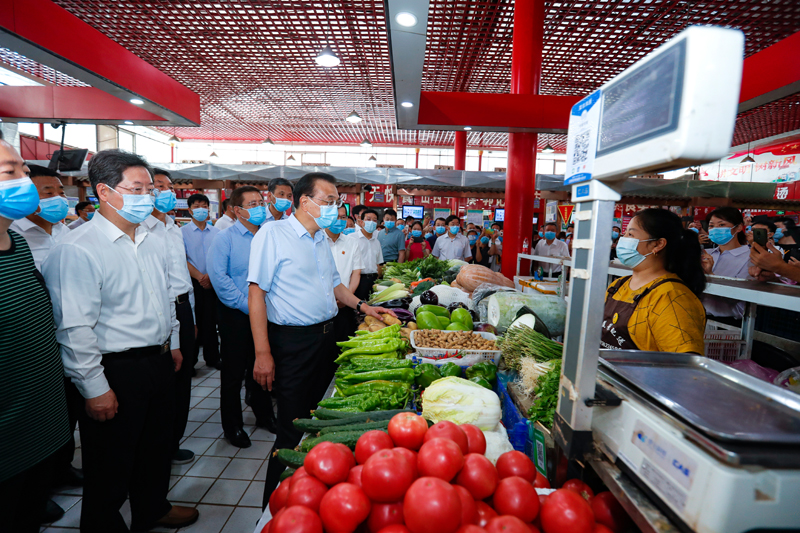 在居民小區(qū),李克強看望受災群眾,叮囑當?shù)刎撠熗緦抑羞M水的居民全面排查并幫助解決困難。他還來到農(nóng)貿(mào)市場,強調(diào)要抓好生活必需品保供穩(wěn)價,繼續(xù)落實好對個體工商戶的支持政策。