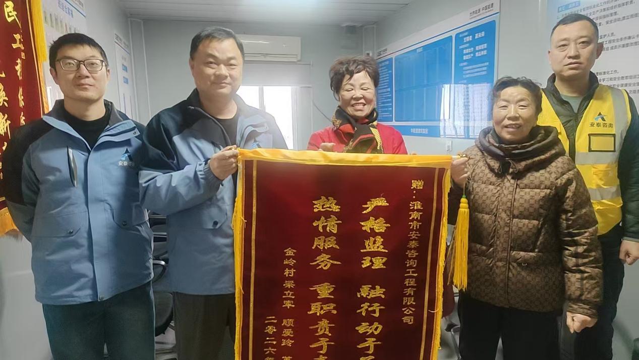 2月6日上午,安泰咨詢公司田區(qū)2025年度城鎮(zhèn)老舊小區(qū)南部片區(qū)改造工程監(jiān)理部收到了金嶺社區(qū)居民贈送的錦旗。錦旗上“嚴(yán)格監(jiān)理融行動于承諾,熱情服務(wù)重職責(zé)于泰山”是對監(jiān)理工作的肯定和認(rèn)可。